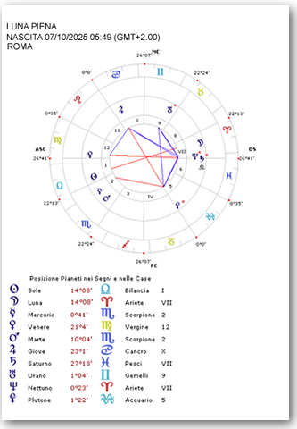 A colpire immediatamente nella carta del Plenilunio di ottobre è la differenza di forza tra i pianeti che governano la Luna in Ariete e il Sole in Bilancia. Da un lato Marte all’apice della potenza nel domicilio notturno dello Scorpione, dall’altra Venere in caduta nel segno, la Vergine che le è meno congeniale, proprio nel momento in cui perde il sostegno di Mercurio, che abbandona la mutua ricezione entrando anche lui in Scorpione. La Luna rivendica una forza che a lungo è rimasta nascosta e che il transito di Marte in Scorpione riporta alla luce con prepotenza.
