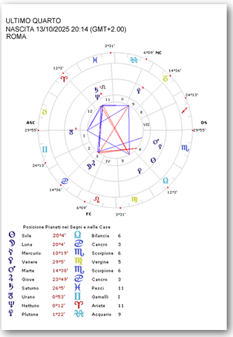 A prima vista nella carta dell’Ultimo Quarto della lunazione di ottobre sembra ripetersi lo squilibrio di forze tra i luminari del Plenilunio: lì la Luna era governata da un Marte nel suo domicilio notturno mentre il Sole era sotto il dominio di una Venere in caduta in Vergine. Qui addirittura la Luna è nel suo domicilio e prossima a una congiunzione con Giove in esaltazione. Ma, come indica la presenza di Venere sugli ultimi minuti del grado anaretico, la situazione sta per cambiare radicalmente con l’ingresso di Venere in Bilancia subito dopo il perfezionamento della fase lunare.
