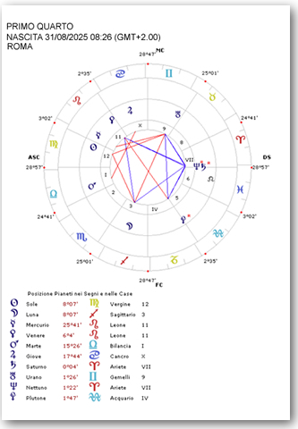 Il Primo Quarto di Luna ci accompagna nel lungo addio all’estate con emozioni intense e contrastanti. La Luna in Sagittario, governata da Giove in Cancro in mutua ricezione, arriva al quadrato al Sole. Sole in Vergine che raffredda temporaneamente gli entusiasmi. L’inevitabile contatto dei sogni con la realtà quotidiana obbliga a fare i conti con l’impegno e la costanza necessaria per realizzarli. Quel Sole in Vergine è però ancora governato da Mercurio in Leone che porta con sé per tutti la consapevolezza della necessità di lasciarsi ispirare dai sogni. Sono loro che ci danno la forza di affrontare la realtà senza rassegnazione